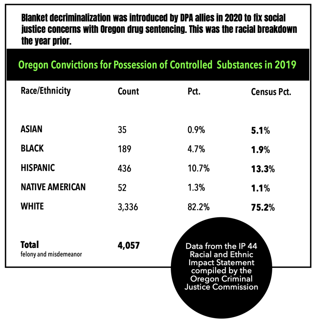 The chart stats are copied from the Racial and Ethnic Impact Statement required by the state. Oregon drug convictions in 2019 were overwhelmingly imposed on white defendants.