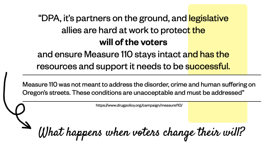 Regular Oregonians were given ONE opportunity to vote on Measure 110, on our ballot in November 2020. Subsequent congressional adjustments were done in consultation with pro-decriminalization lobbyists, partners and legislative allies.