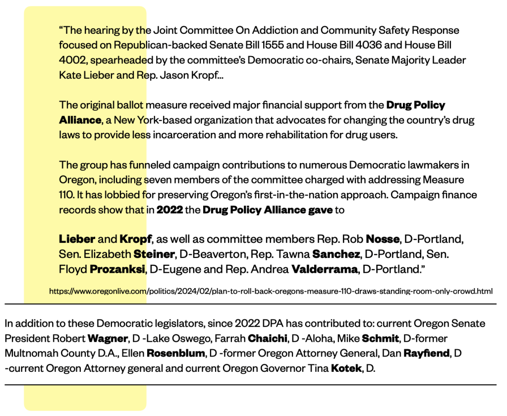 The 2024 legislature Joint Addiction and Community Safety Response Committee had 10 members, 3 Republicans and 7 Democrats. The Oregonian’s Noelle Crombie reported all of the Democratic committee members received political donations from the Drug Policy Alliance, the organization behind the original law. DPA, based in New York, also had a dedicated in-state lobbyist and activist groups participating with Oregon legislators.
